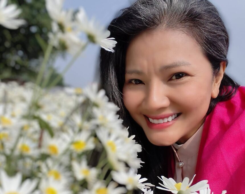 Kiều Trinh “đốn tim” với nụ cười rạng rỡ giữa vườn hoa bãi đá sông Hồng