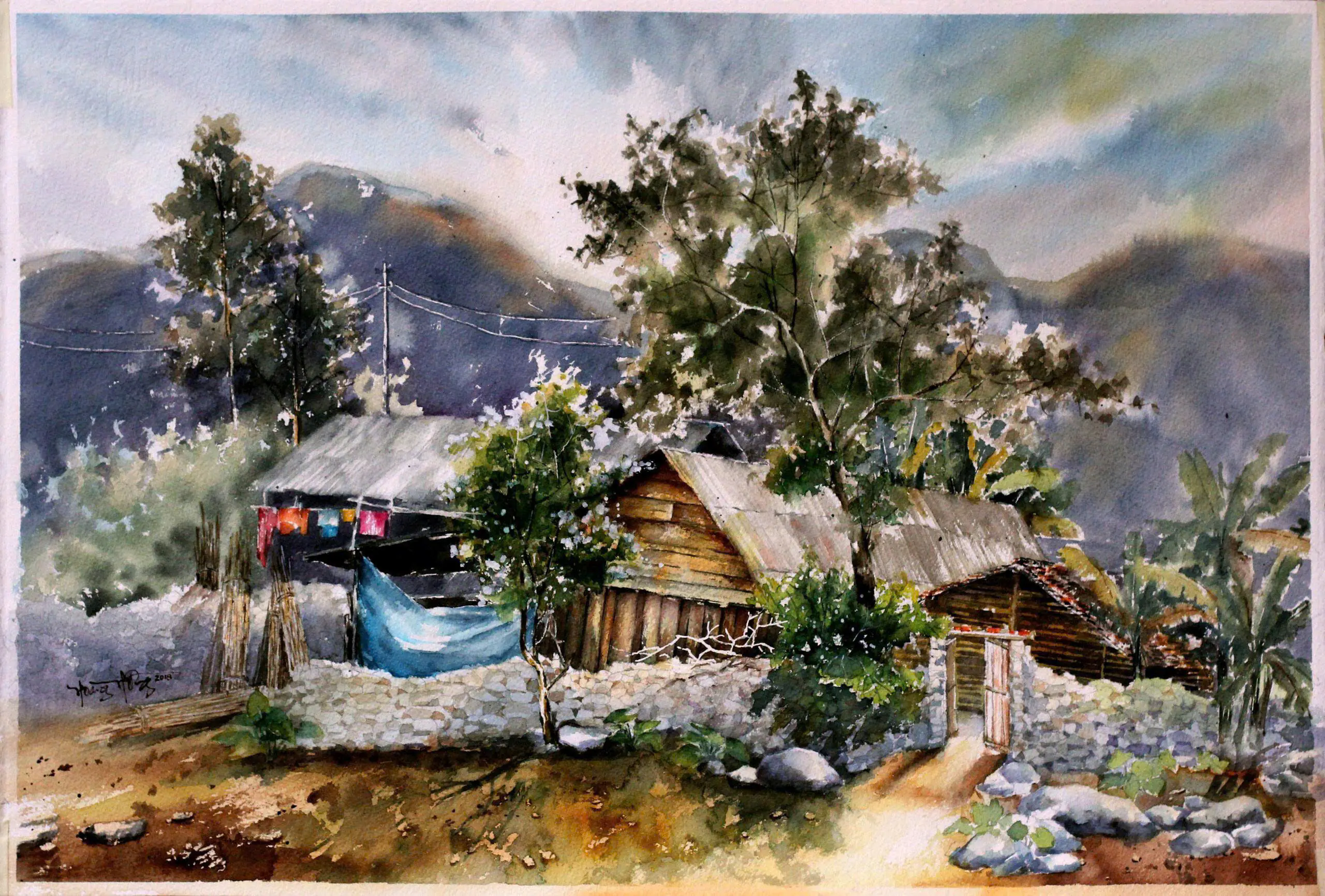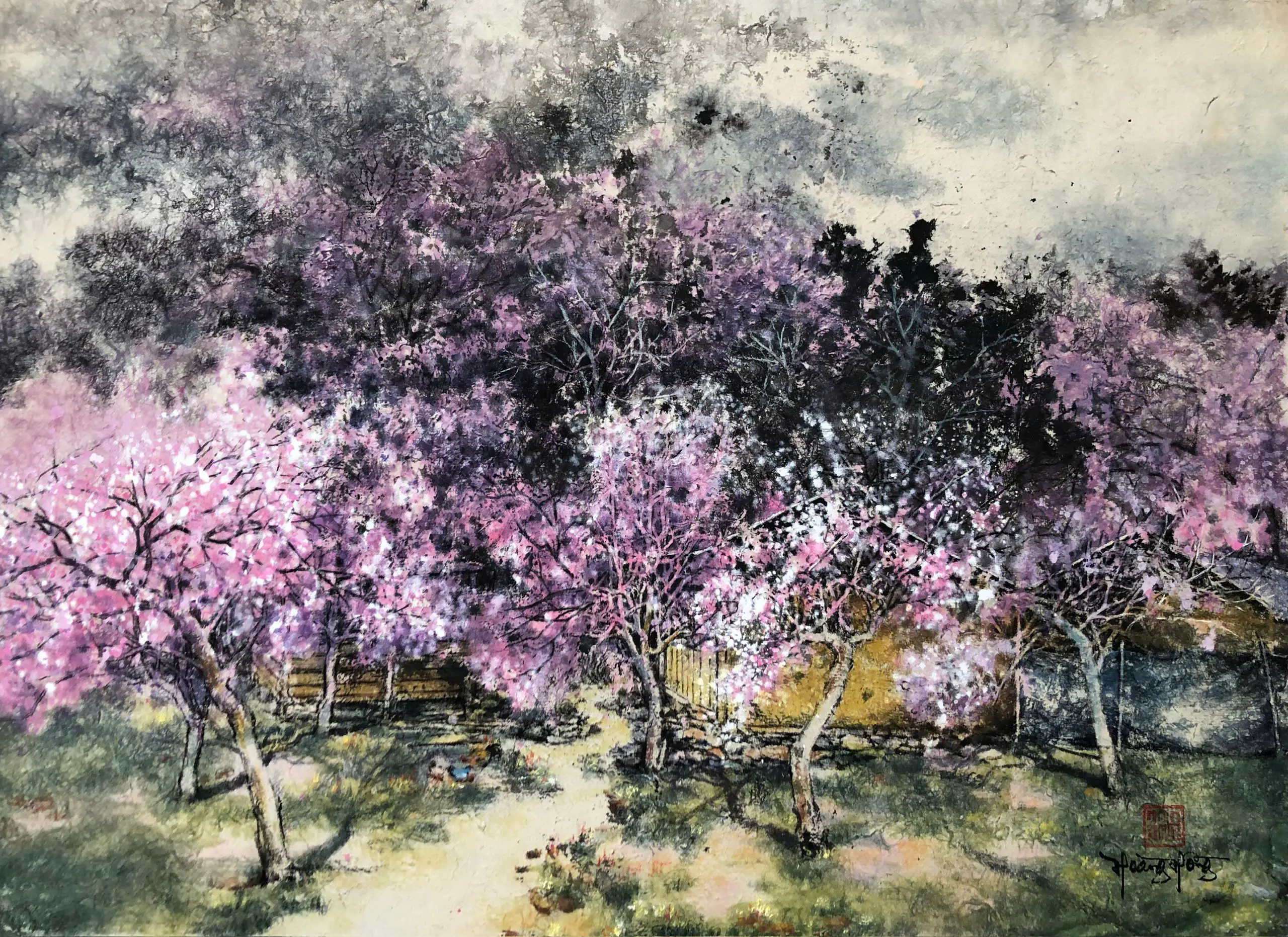 Trong tranh, nước không chỉ là chất liệu hay kỹ thuật, mà là ký ức, là nhịp thở của sự sống. Nước loang trong mực, tan trong màu, thấm vào lụa, để lại những vệt mờ mong manh, gợi cảm giác về thời gian, sự chảy trôi và lưu giữ. Những hình ảnh quen thuộc của làng quê Việt Nam hiện lên qua gợi mở, để người xem tự kết nối với trải nghiệm và ký ức của chính mình.