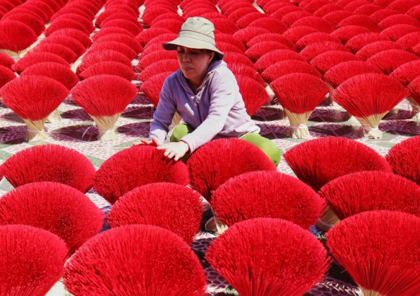 Những ngày cuối năm, làng nhang trăm tuổi ở xã Lê Minh Xuân (huyện Bình Chánh, TPHCM) lại khoác lên mình “bộ áo” rực rỡ sắc màu. Mặc dù tình hình sản xuất không còn sôi động như những năm trước nhưng đây cũng là nơi thu hút nhiều bạn trẻ và khách du lịch đến tham quan, chụp hình vào dịp cận Tết.