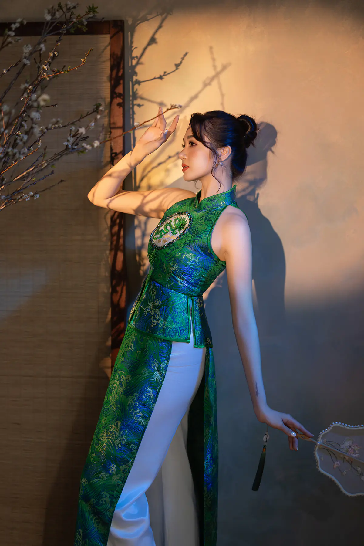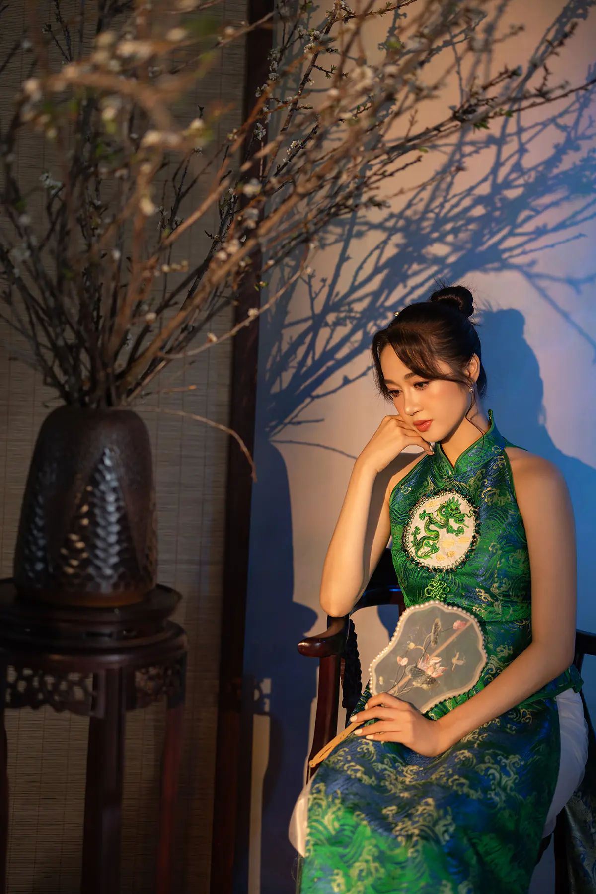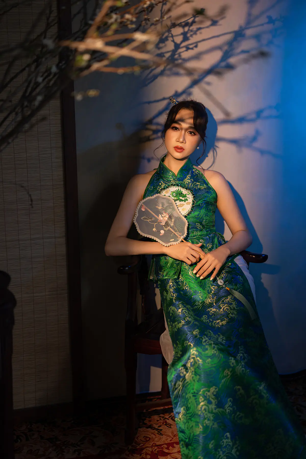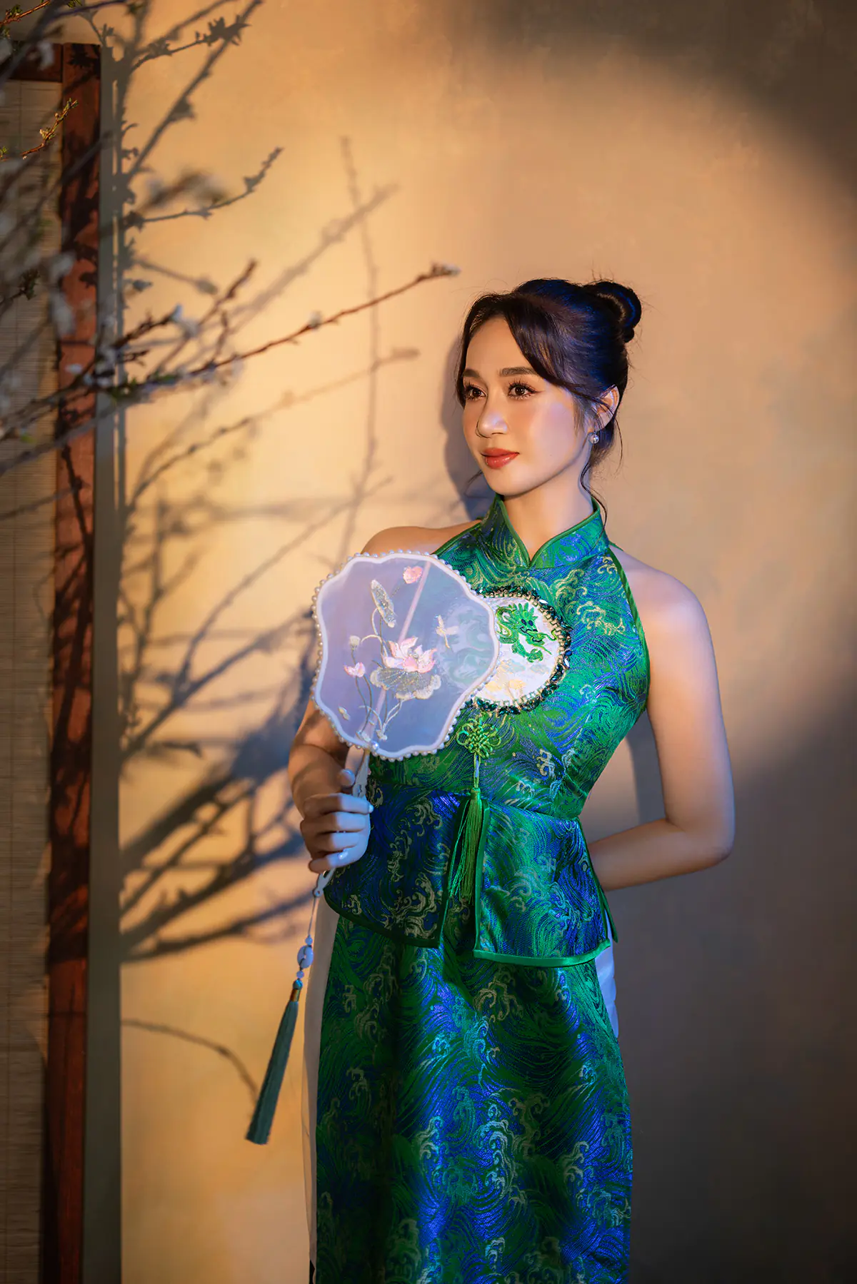 Không gian tĩnh lặng, nhành hoa xuân khẽ nghiêng, những vệt bóng đổ dài trên tường,… tất cả tạo nên bối cảnh giàu tính tạo hình. Trong tà áo dài xanh thẫm với họa tiết cổ điển của Elysia Couture by NTK Nguyễn Kim Phụng, Lê Thu An hiện lên với vẻ đẹp trầm mặc, sâu lắng. Ánh sáng lướt qua gương mặt cô như một lớp sương mỏng vừa tôn lên đường nét thanh tú vừa khắc họa chiều sâu cảm xúc trong ánh nhìn.