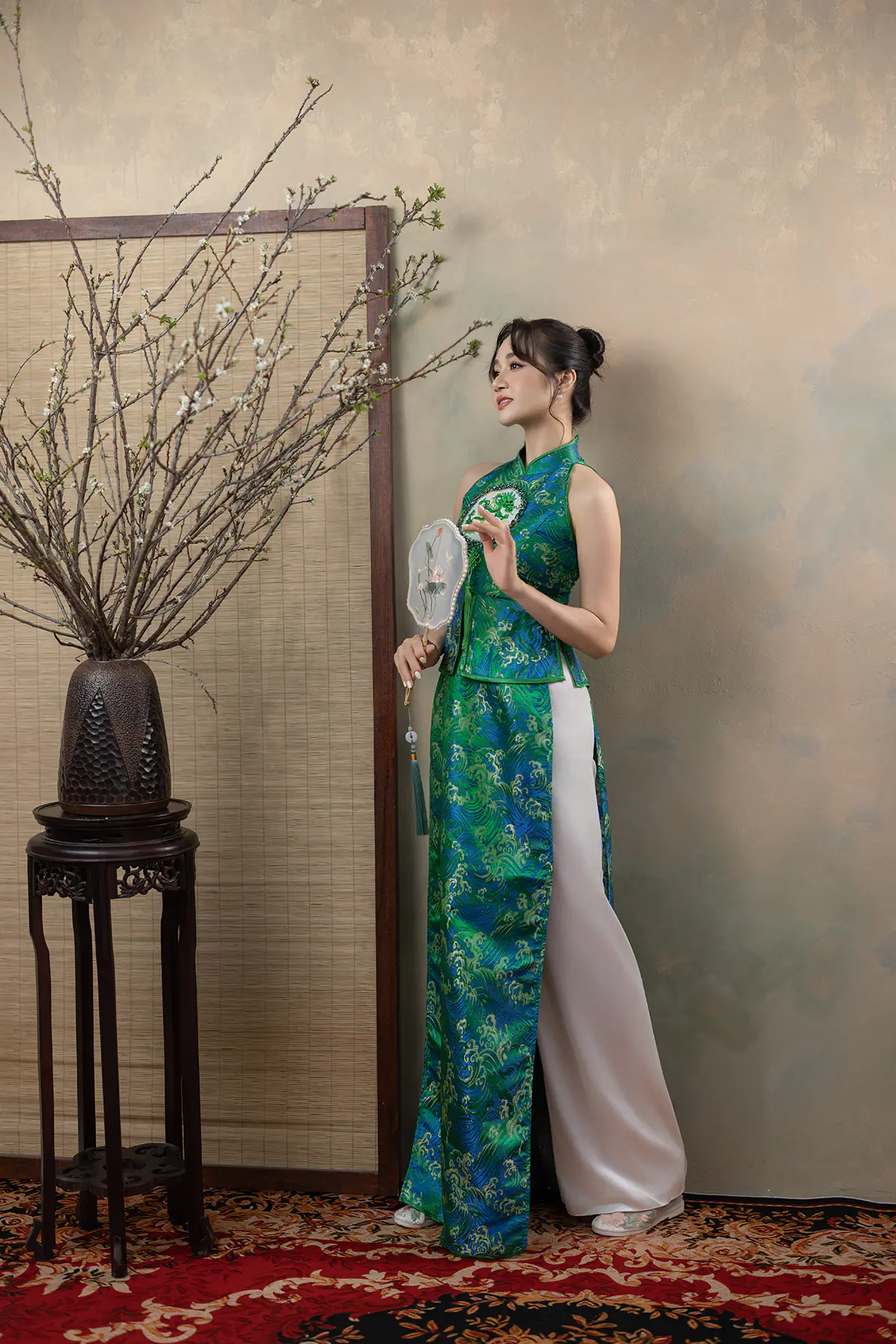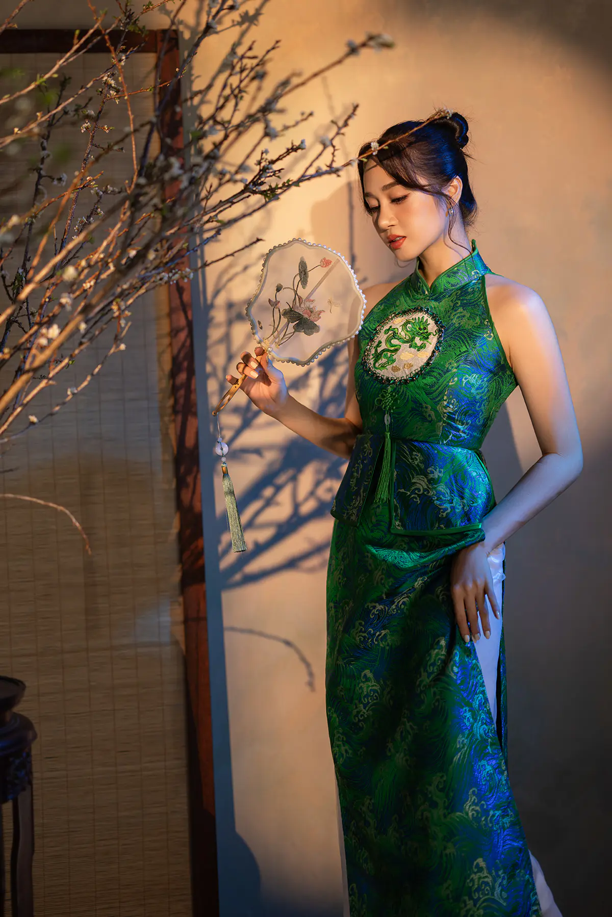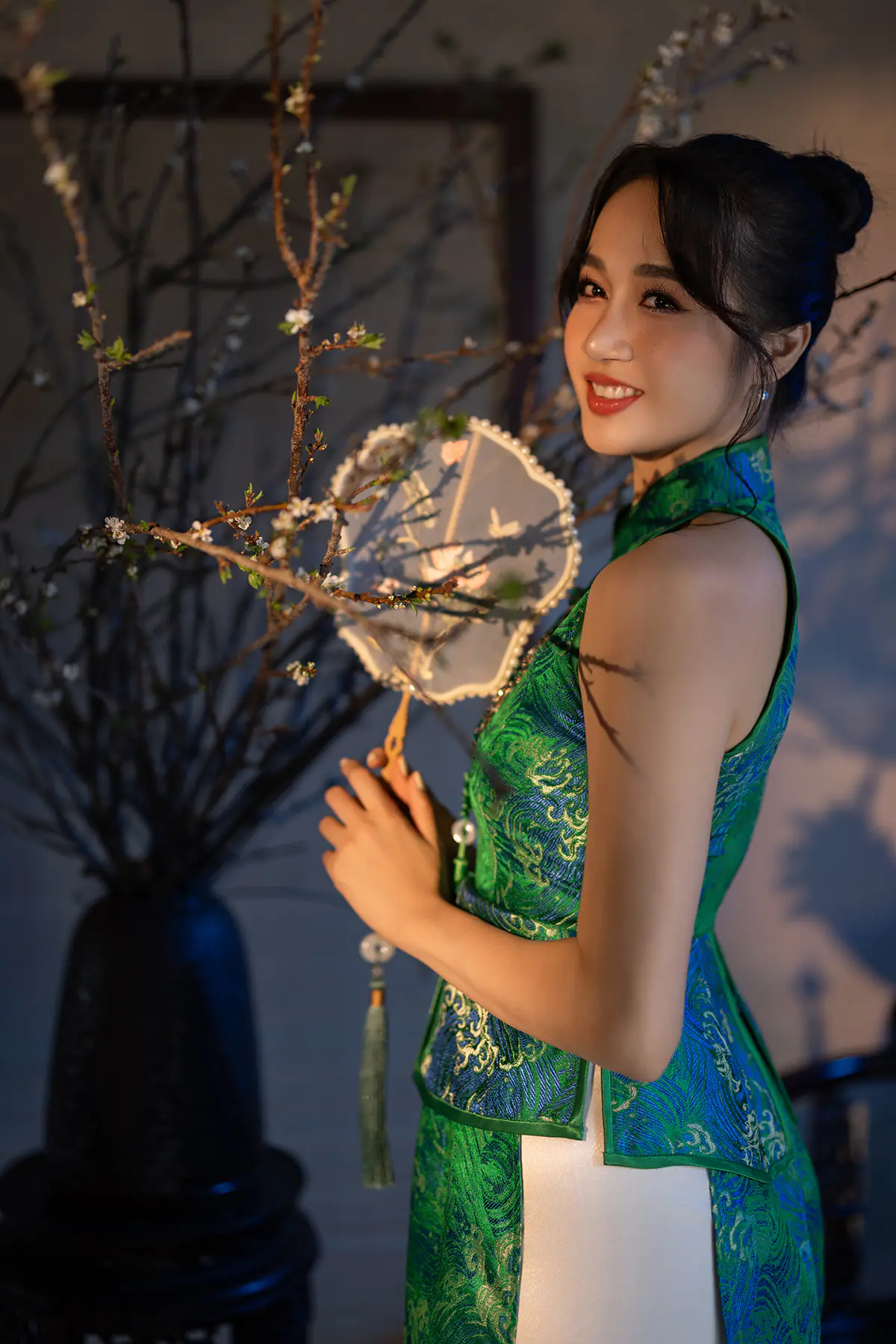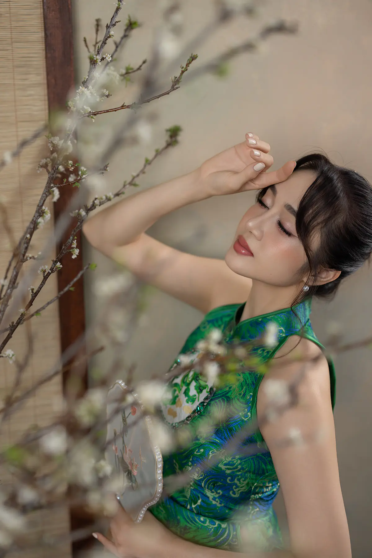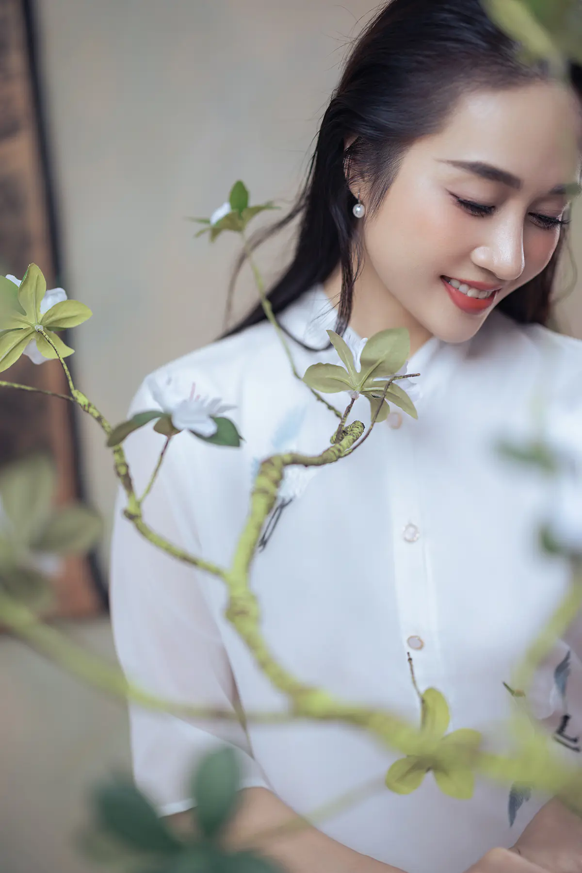 Không gian tĩnh lặng, nhành hoa xuân khẽ nghiêng, những vệt bóng đổ dài trên tường,… tất cả tạo nên bối cảnh giàu tính tạo hình. Trong tà áo dài xanh thẫm với họa tiết cổ điển của Elysia Couture by NTK Nguyễn Kim Phụng, Lê Thu An hiện lên với vẻ đẹp trầm mặc, sâu lắng. Ánh sáng lướt qua gương mặt cô như một lớp sương mỏng vừa tôn lên đường nét thanh tú vừa khắc họa chiều sâu cảm xúc trong ánh nhìn.