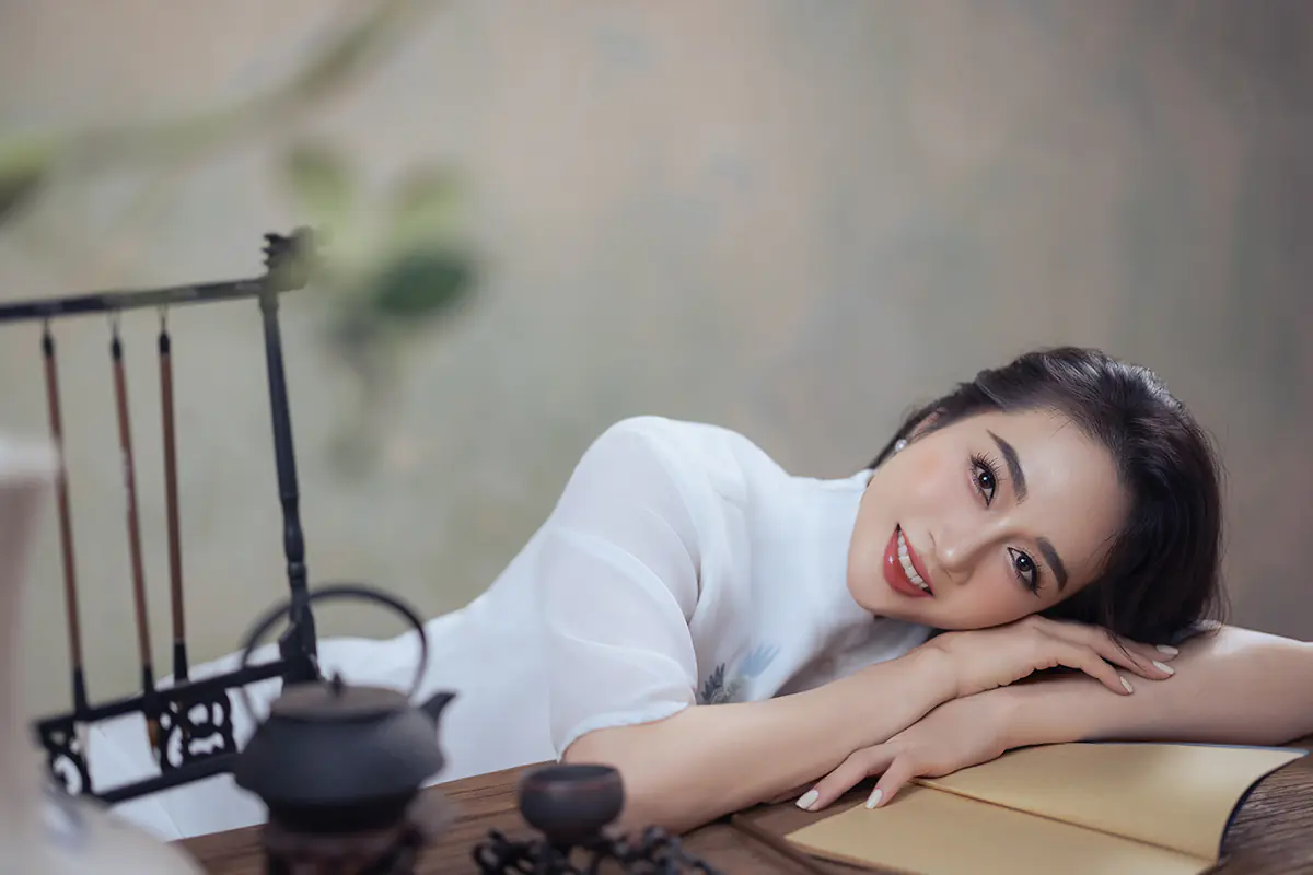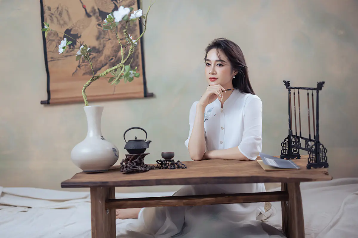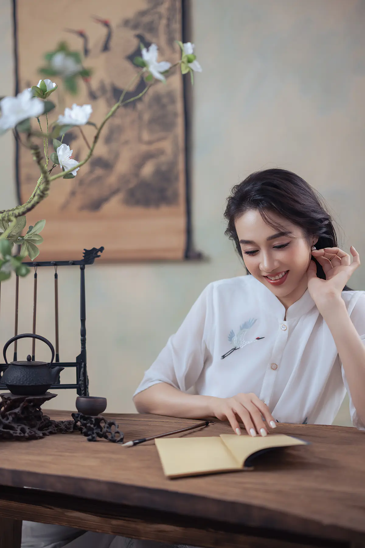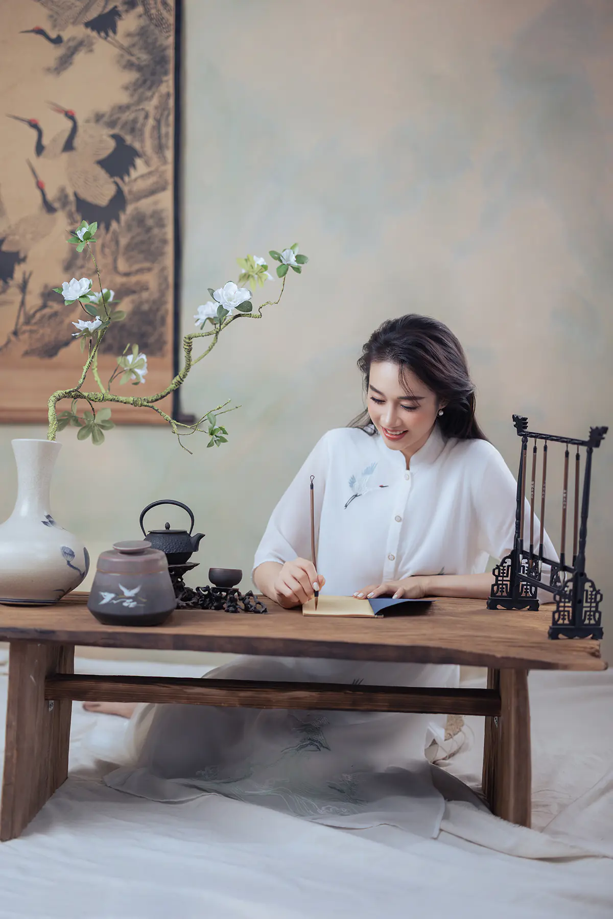 Sự chuyển đổi sang tà áo dài trắng mang đến một gam màu khác cho câu chuyện hình ảnh. Không gian trà đạo và thư phòng thanh tịnh mở ra một nhịp điệu nhẹ nhàng, nơi người phụ nữ hiện lên với vẻ đẹp trí tuệ và an nhiên. Hình ảnh Lê Thu An đọc sách, thưởng trà hay mỉm cười trước ống kính gợi nên cảm giác bình yên, như một cảnh phim giàu chất thơ về đời sống tinh thần.
