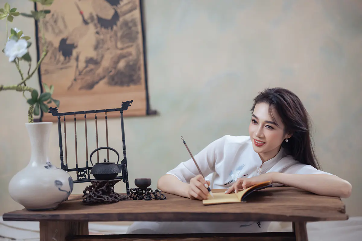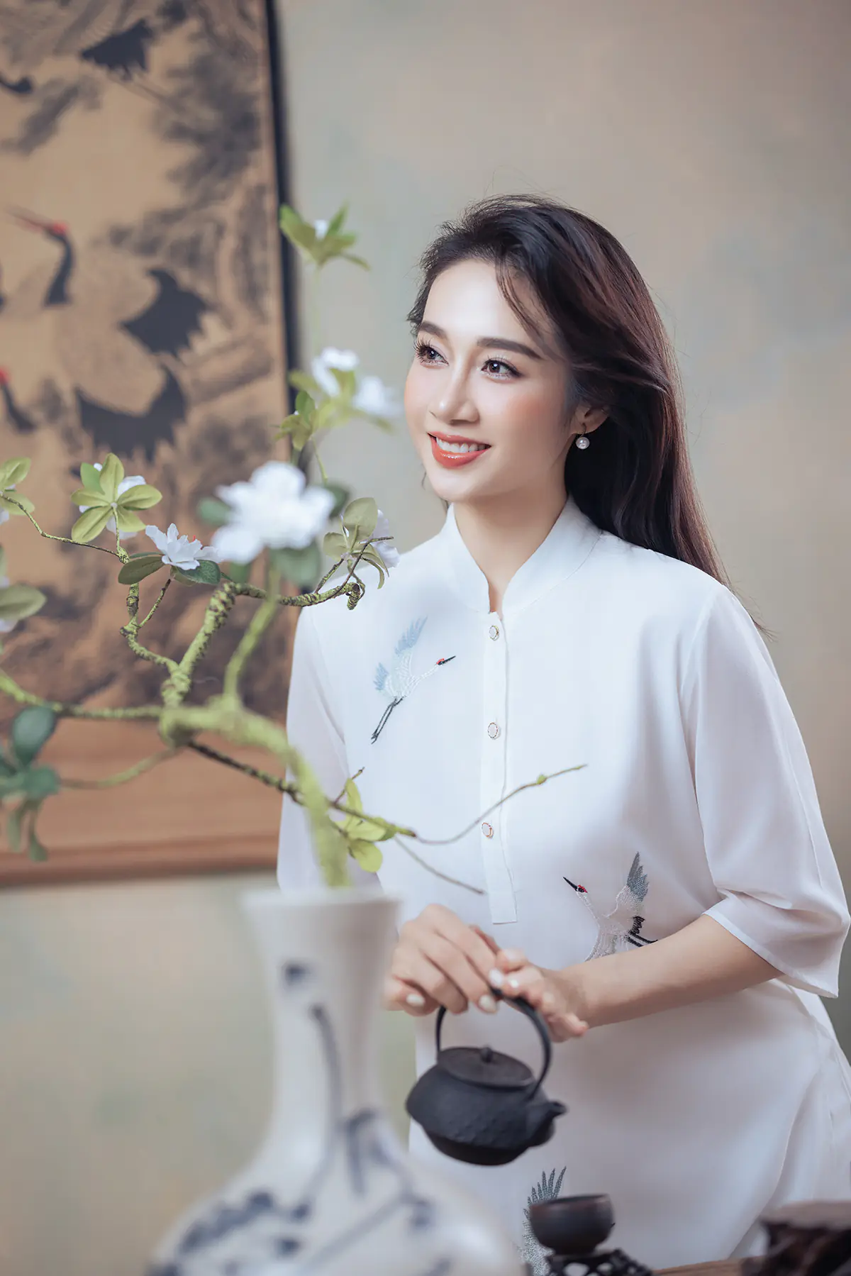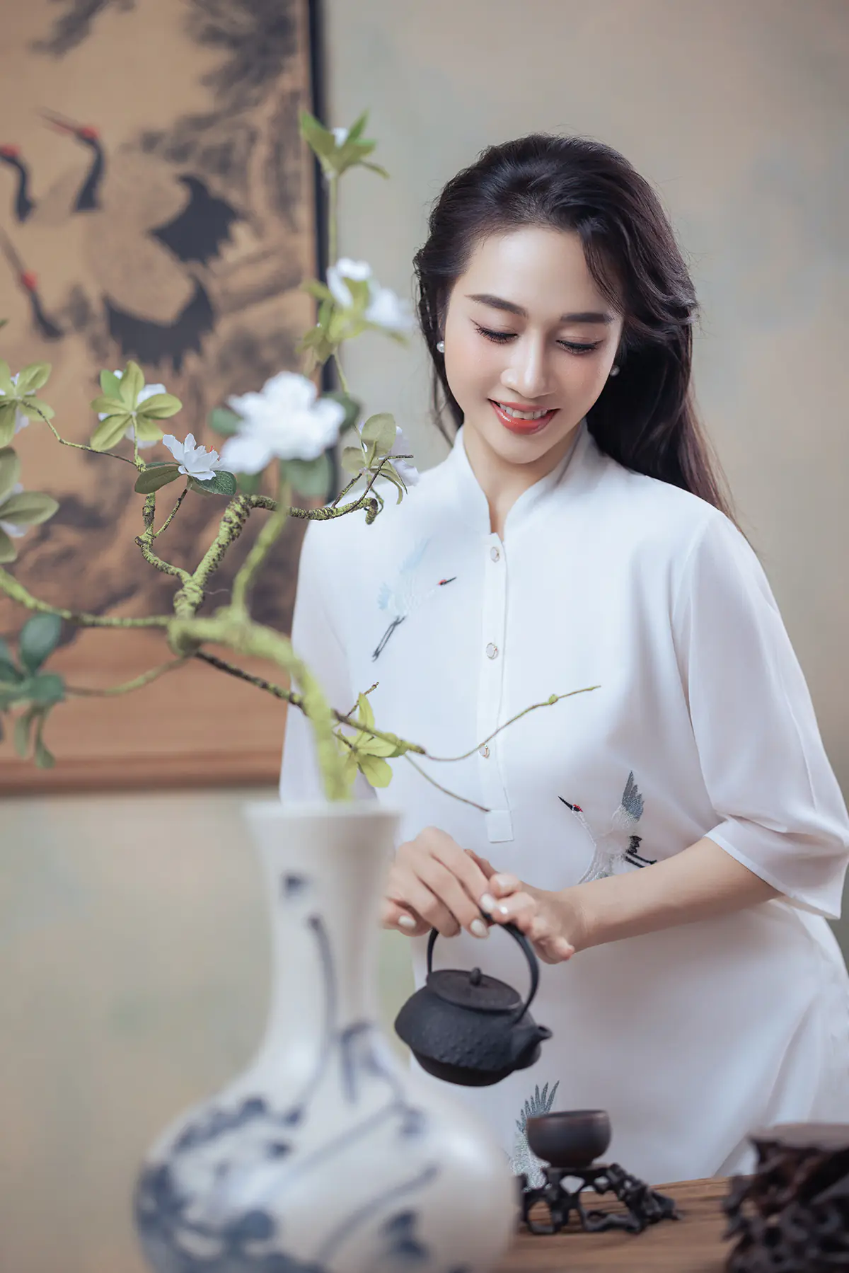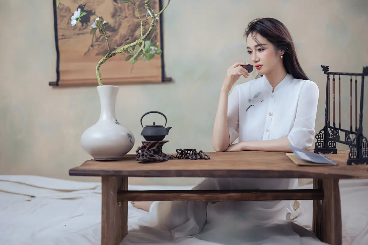 Sự chuyển đổi sang tà áo dài trắng mang đến một gam màu khác cho câu chuyện hình ảnh. Không gian trà đạo và thư phòng thanh tịnh mở ra một nhịp điệu nhẹ nhàng, nơi người phụ nữ hiện lên với vẻ đẹp trí tuệ và an nhiên. Hình ảnh Lê Thu An đọc sách, thưởng trà hay mỉm cười trước ống kính gợi nên cảm giác bình yên, như một cảnh phim giàu chất thơ về đời sống tinh thần.