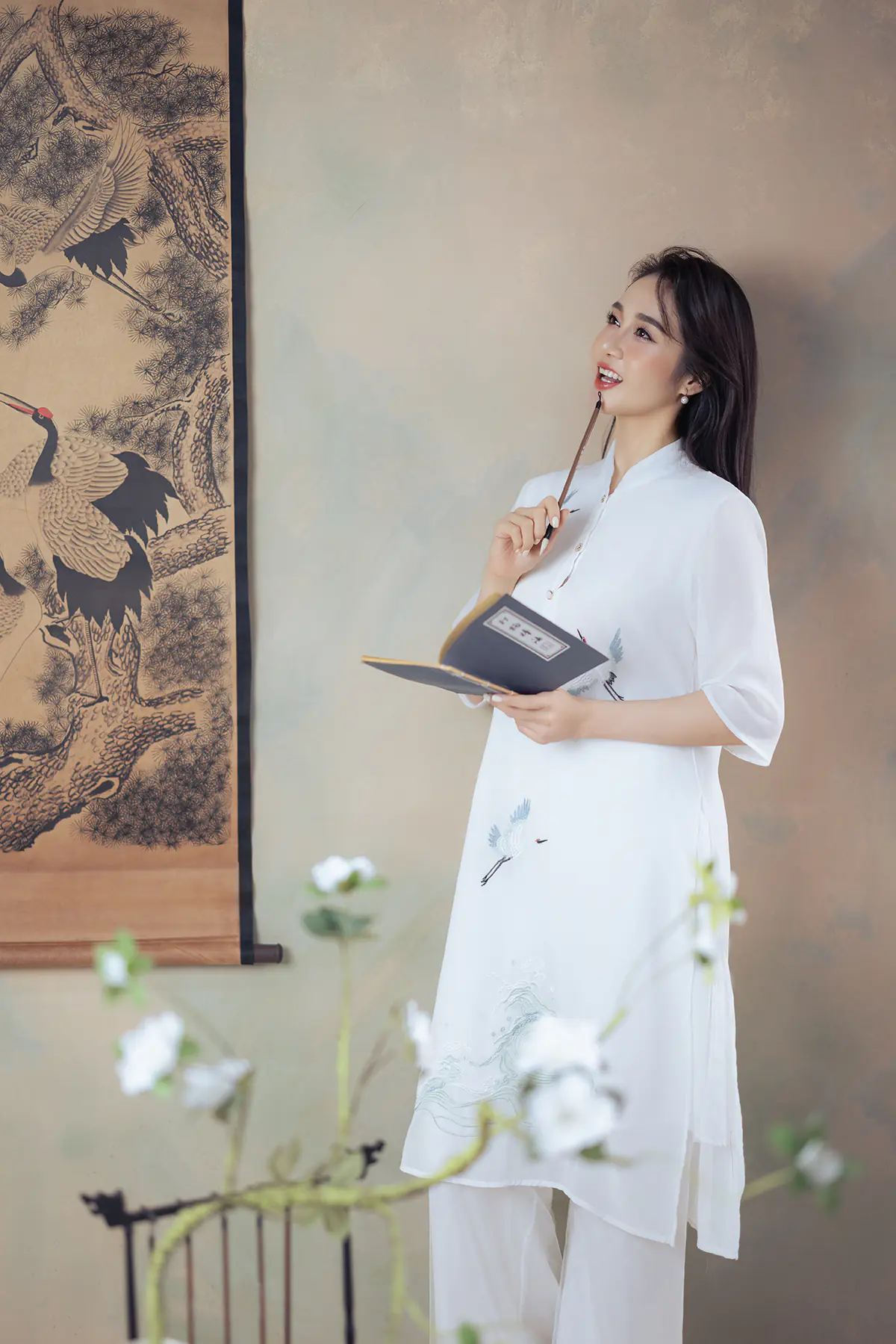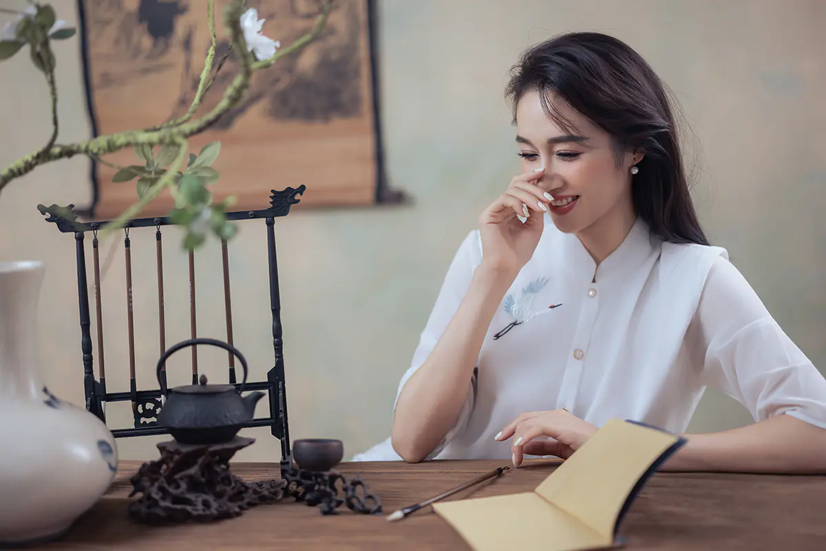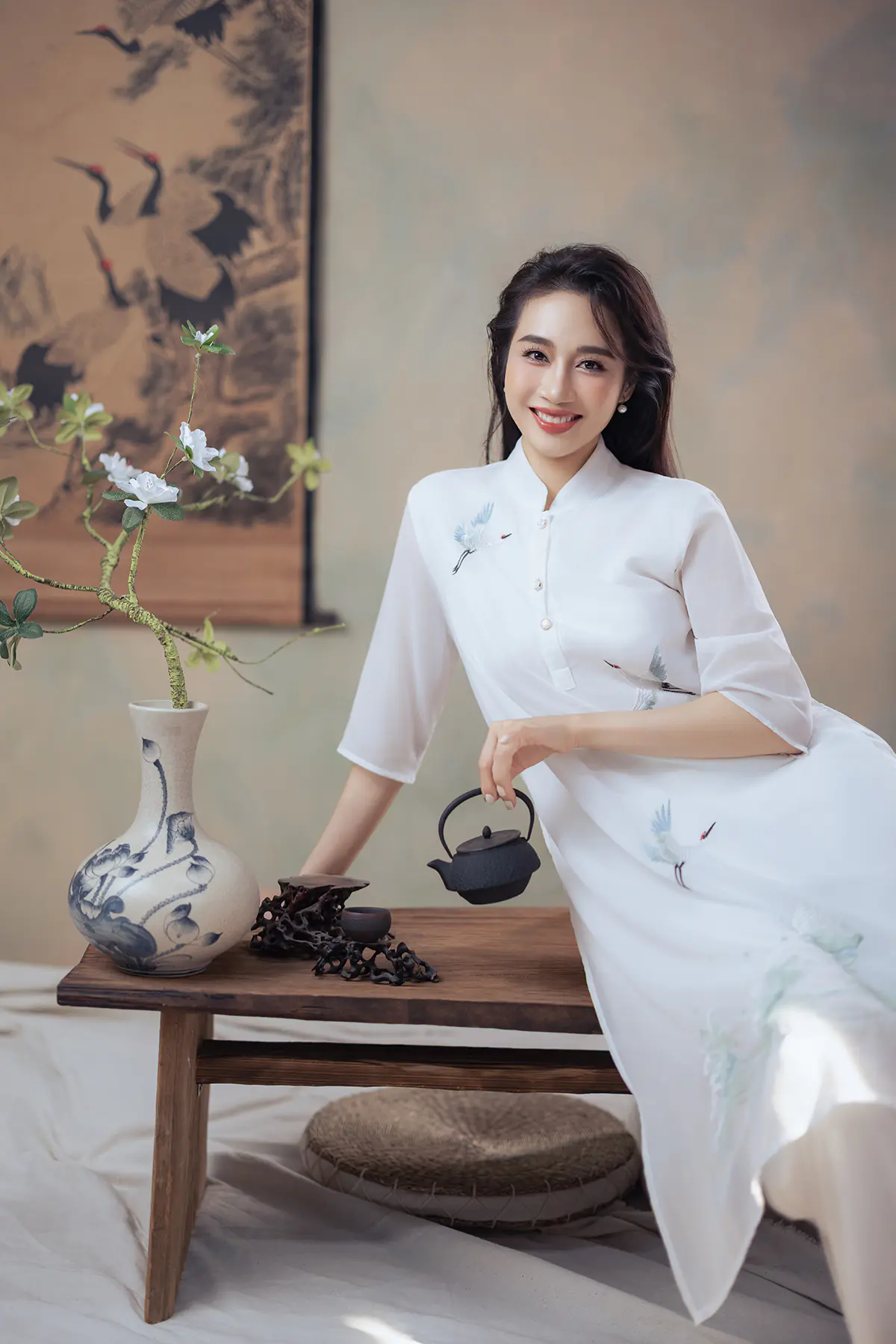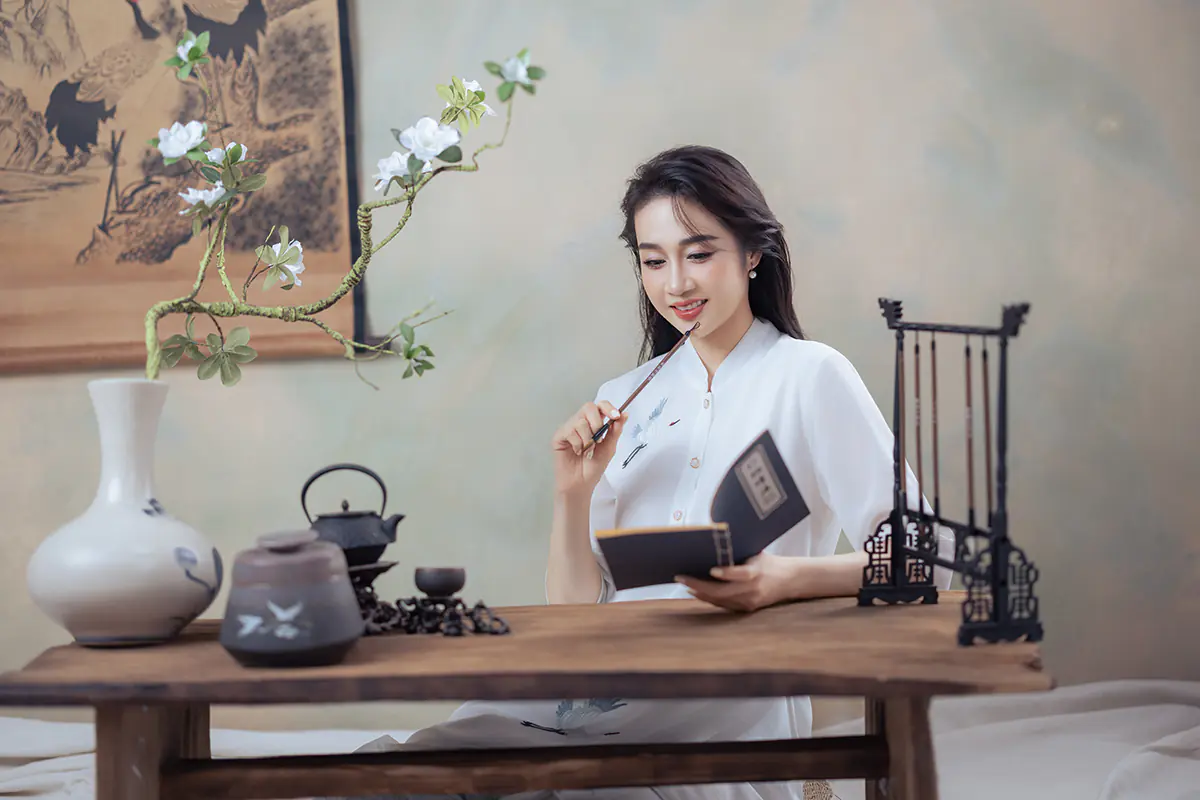 Sự chuyển đổi sang tà áo dài trắng mang đến một gam màu khác cho câu chuyện hình ảnh. Không gian trà đạo và thư phòng thanh tịnh mở ra một nhịp điệu nhẹ nhàng, nơi người phụ nữ hiện lên với vẻ đẹp trí tuệ và an nhiên. Hình ảnh Lê Thu An đọc sách, thưởng trà hay mỉm cười trước ống kính gợi nên cảm giác bình yên, như một cảnh phim giàu chất thơ về đời sống tinh thần.