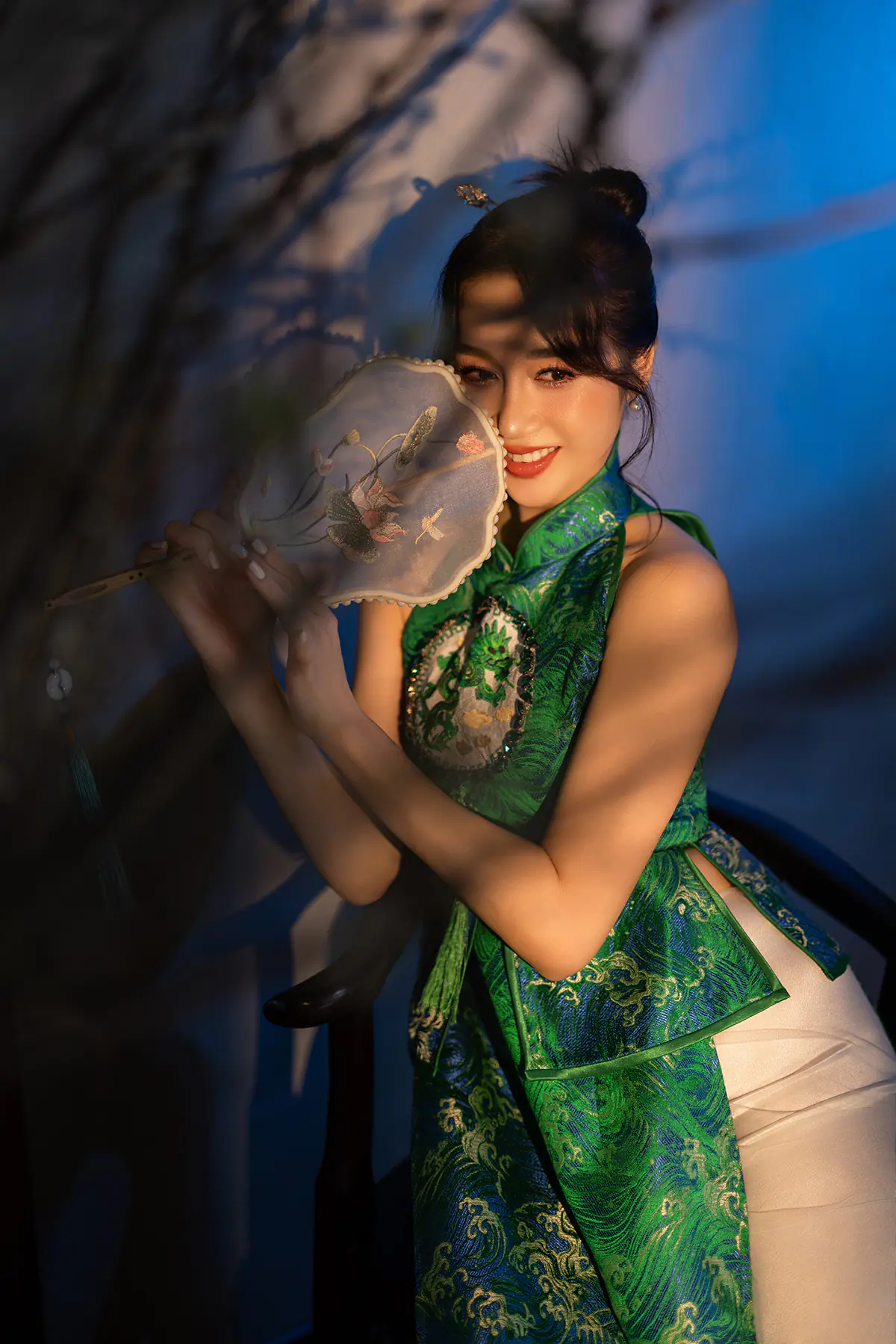 Mỗi chuyển động của cô đều chậm rãi, có tiết tấu như ngôn ngữ của điện ảnh. Từ bàn tay nâng chiếc quạt lụa, dáng ngồi tựa ghế đến ánh mắt lặng yên hướng về khoảng không, tất cả gợi nên cảm giác về một khoảnh khắc đang dừng lại giữa dòng chảy thời gian. Ở đó, vẻ đẹp không nằm ở sự phô diễn mà hiện hữu trong sự tinh tế và chiều sâu nội tâm.