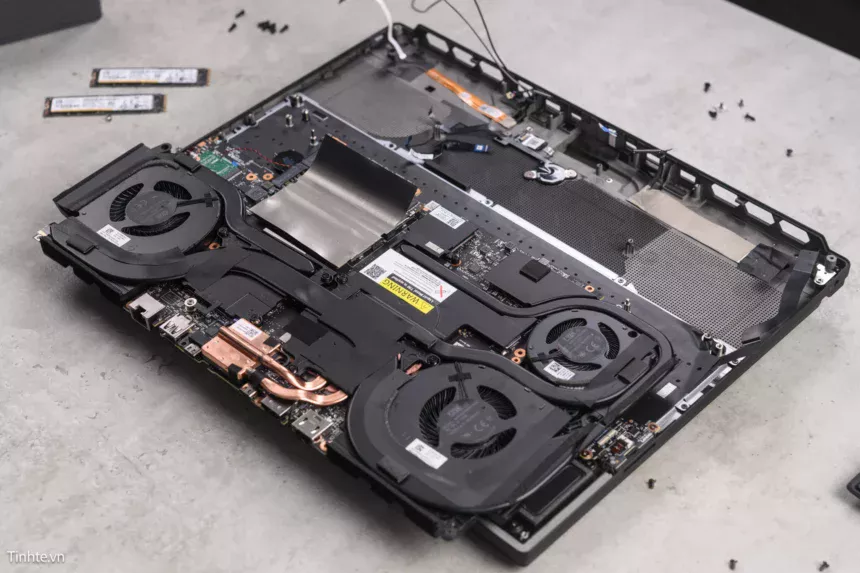 Phải thừa nhận rằng để có thể mở được Legion 9i là một việc không hề dễ dàng một chút nào, có rất nhiều dây điện cả lớn cả nhỏ nằm bên trong, phải gỡ từng cái một mới có thể gỡ được phần mainboard rồi sau đó mới tiếp cận được đến với CPU và GPU.