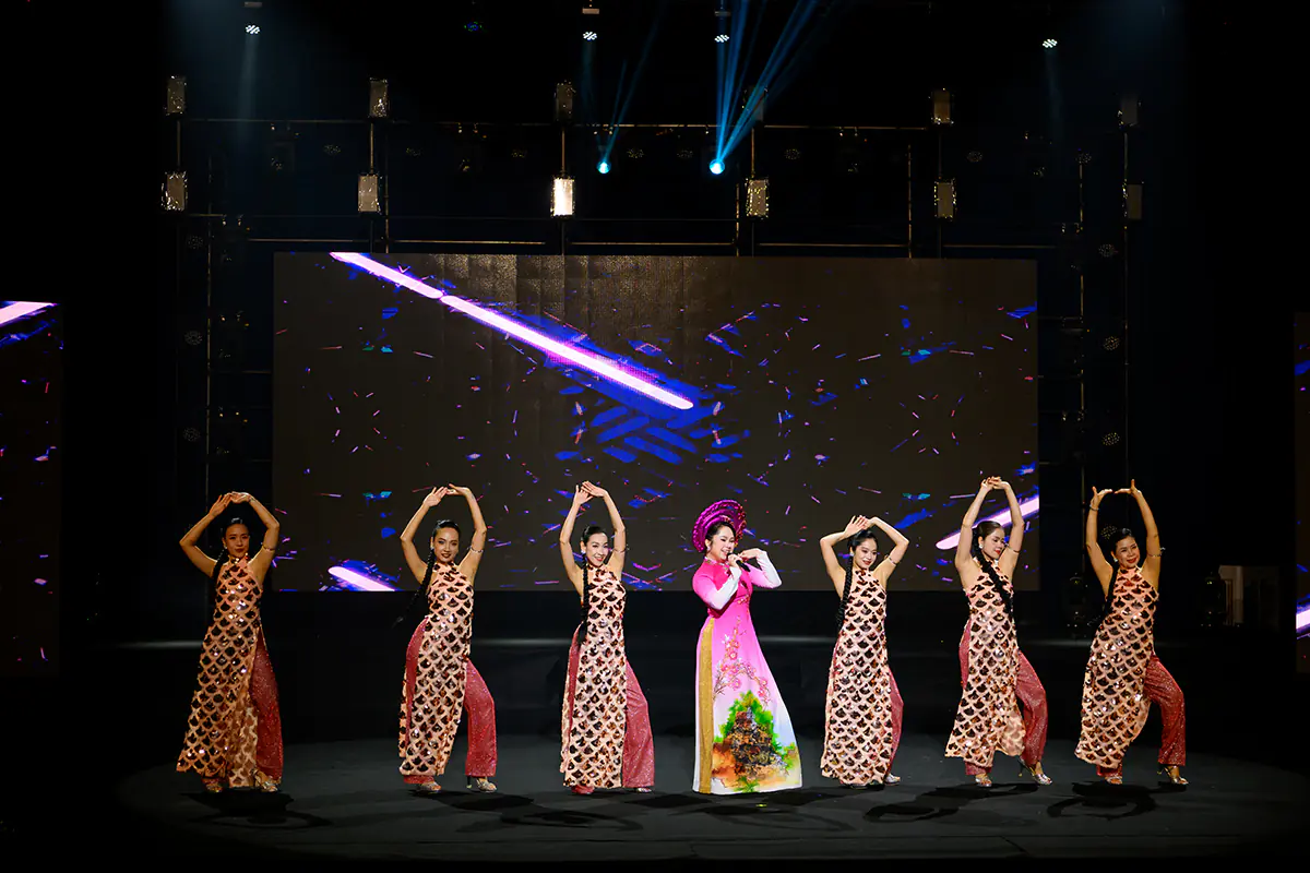 Điểm đáng chú ý là cách Victoria Nguyễn kết hợp giữa giọng hát và ngôn ngữ hình thể. Đồng hành cùng cô là vũ đoàn với những chuyển động đồng đều, mềm mại, tạo nên một tổng thể trình diễn hài hòa. Trong khi các vũ công sử dụng trang phục ánh kim mang hơi hướng hiện đại, hình ảnh trung tâm của Victoria Nguyễn trong tà áo dài lại trở thành điểm neo thị giác vừa nổi bật vừa mang tính biểu tượng.